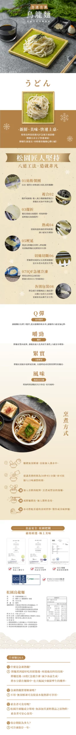 首頁/調理食品/松園烏龍麵(5片裝) 松園烏龍麵(5片裝)NT$120 松園烏龍麵(5片裝) 數量 加入購物車 分類: 調理食品 描述 重量 180g 營養成分(每100g) 熱量 (Calories): 138 大卡 (kcal) 蛋白質 (Protein): 4 公克 (g) 總脂肪 (Total Fat): 0.6 公克 (g) 飽和脂肪 (Saturated Fat): 0.1 公克 (g) 反式脂肪 (Trans Fat): 0 公克 (g) 碳水化合物 (Carbohydrates): 30 公克 (g) 鈉 (Sodium): 180 毫克 (mg) 保存期限 依包裝所標示 保存方式 冷凍保存 ≤ -18度 原產地 台灣 相關商品 古早味鐵路豬排(120g) NT$56 加入購物車 黑胡椒豬柳(150g) NT$70 加入購物車 淄博燒烤豬肋排(500g) NT$270 加入購物車 日式黃金緋魚尼信(約140g) NT$130 加入購物車
